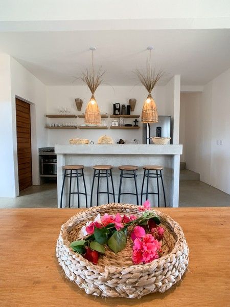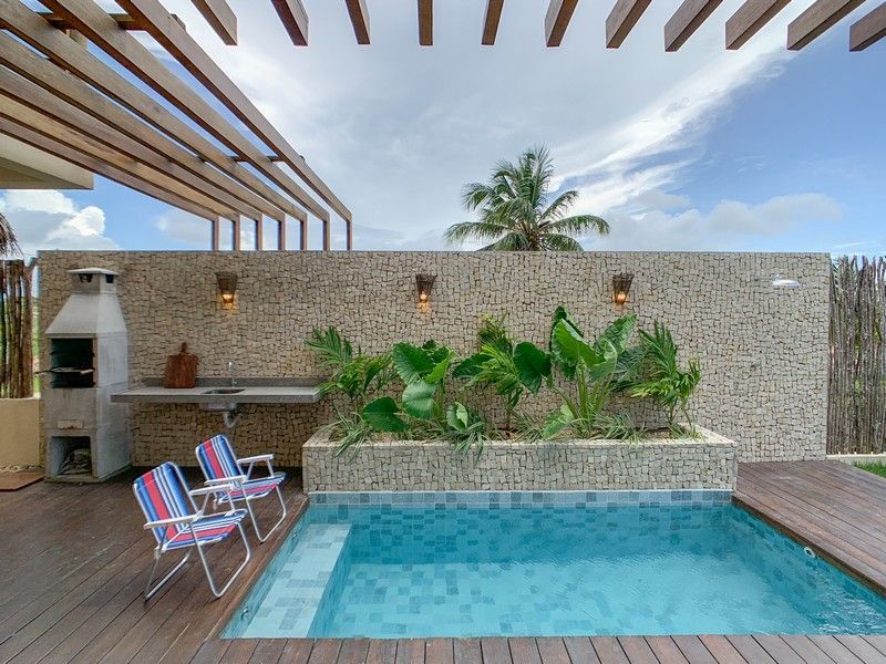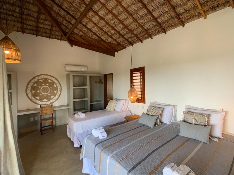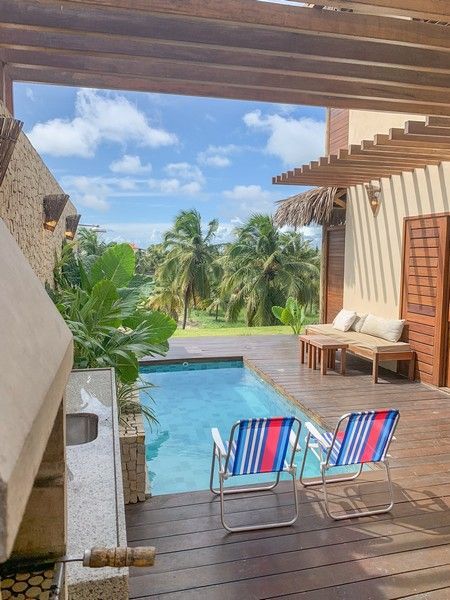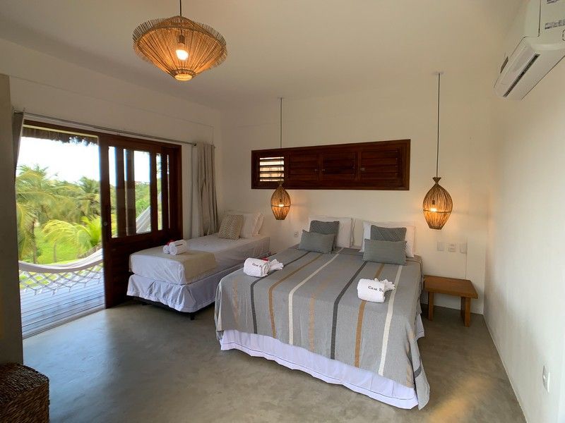 Cada suíte tem seu próprio terraço privativo com redes para apreciar a vista maravilhosa do coqueiral. Você pode desfrutar de uma vista para o mar no andar de cima. Um bonito deck faz fronteira com a piscina no piso térreo, bem como uma área de churrasco idealmente localizada para as suas noites com amigos ou familiares.