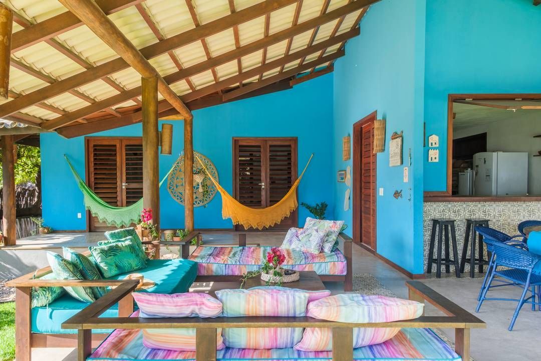 Há uma varanda com redes onde o vento balança o ano todo, e uma cozinha (toda equipada) que é o sonho de qualquer cozinheiro, pois fica de frente pro mar e se integra com quem está na varanda.